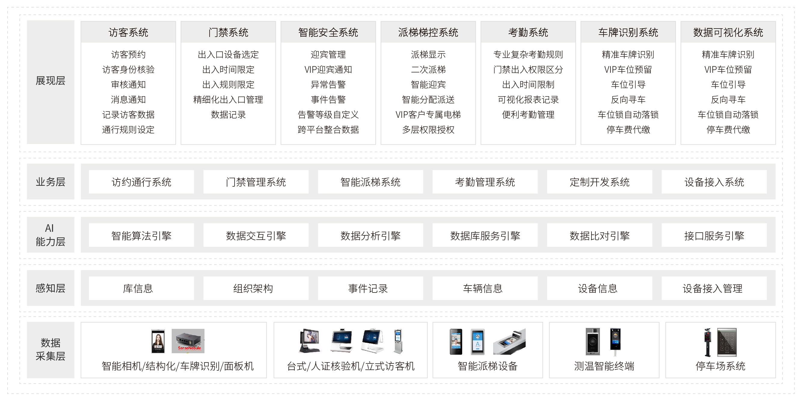 智能、安全:无感识别、OCR识别、边缘计算、人数统计、行为分析、视频结构化、可视化、贵宾车预留;智能巡更、防尾随、事件告警联动、区块链数据保存