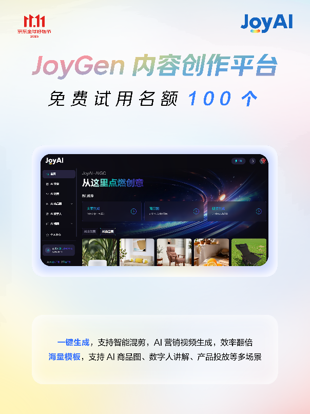 内容创作一直是电商经营的痛点所在◈✿ღ。大促期间◈✿ღ,商家需要投放大量视频◈✿ღ、图文内容进行推广◈✿ღ,传统内容制作模式周期长◈✿ღ、成本高◈✿ღ。京东JoyGen内容创作平台首次开放免费试用◈✿ღ,输入商品链接尊龙凯时人生就是博◈✿ღ,即可一键生成营销视频◈✿ღ,内置智能混剪功能◈✿ღ,可快速产出适合不同渠道的内容素材◈✿ღ。参与内测的商家表示◈✿ღ:“过去制作一个商品种草视频需要至少半天时间尊龙凯时人生◈✿ღ,现在通过AIGC平台ribenrenti◈✿ღ,5分钟就能生成多条视频◈✿ღ,效率提升显著◈✿ღ。”